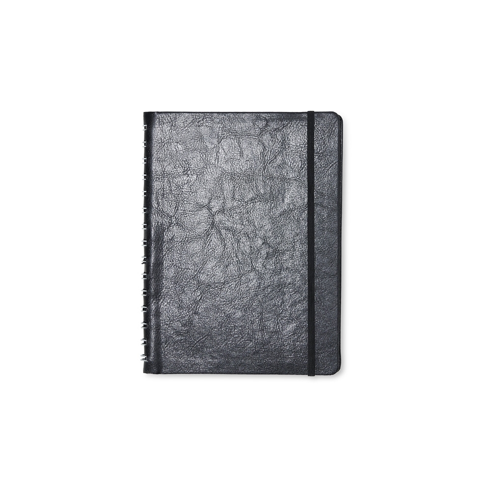 Agenda diária wire-o 2023 de couro sintético com elástico para lacre. Contém páginas para dados pessoais, calendário de 2022 à 2024, endereços da internet, mapa do Brasil, mapa-múndi, índice telefônico e planejamento.