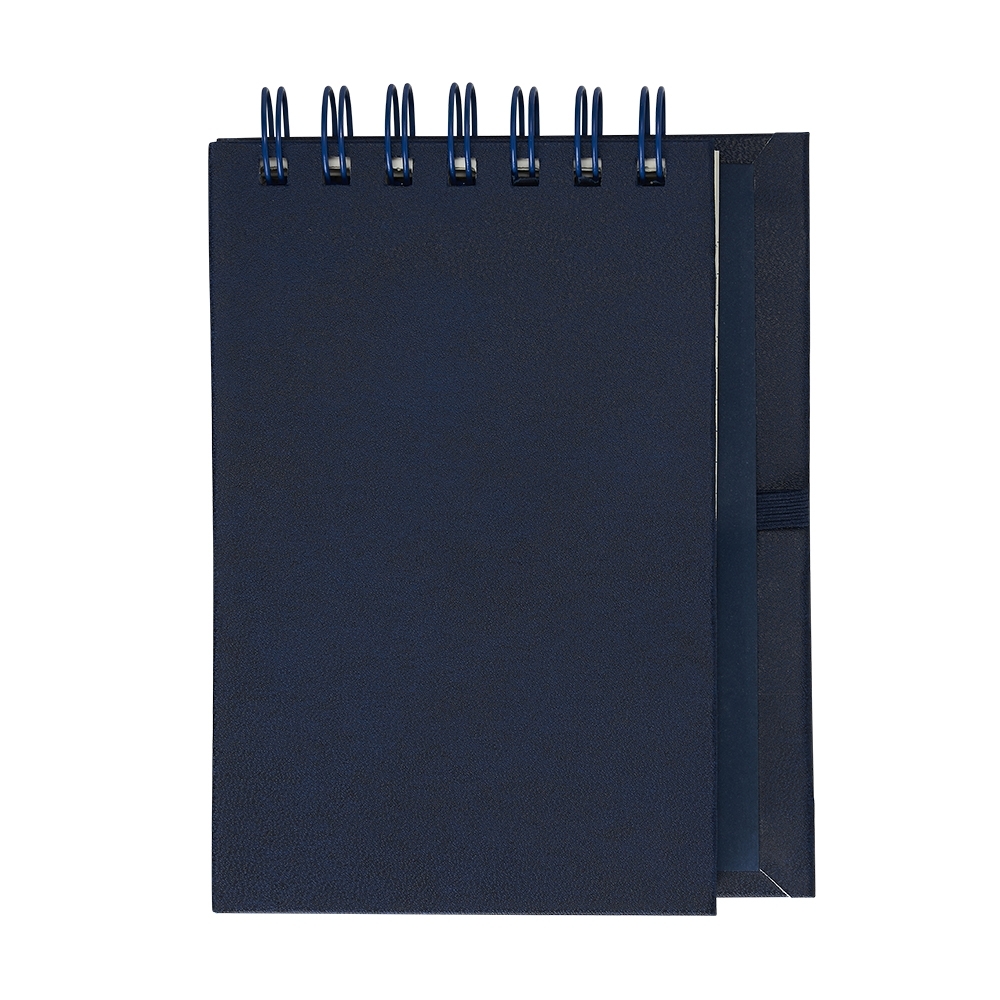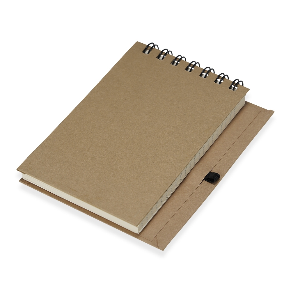 Bloco de anotação em couro sintético com porta caneta e wire-o. Possui aproximadamente 100 folhas com frente pautada. Obs.: Exclusivamente a cor kraft é capa é produzida em papel kraft.