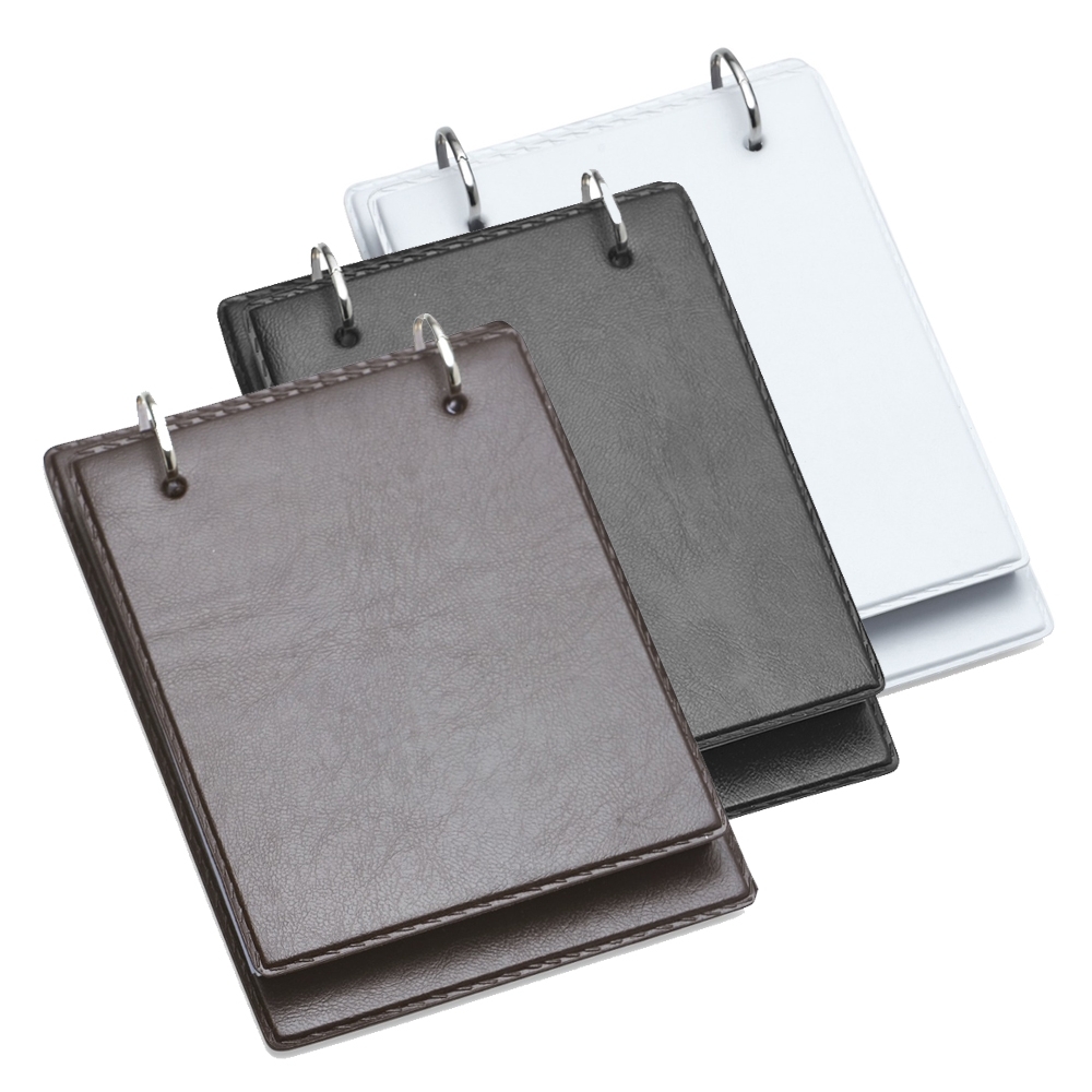 Bloco de anotação de mesa com trilho de ferro, material couro sintético. Possui aproximadamente 150 folhas sem pauta. OBS.: PEDIDOS APENAS MÚLTIPLOS DE 10 PEÇAS!