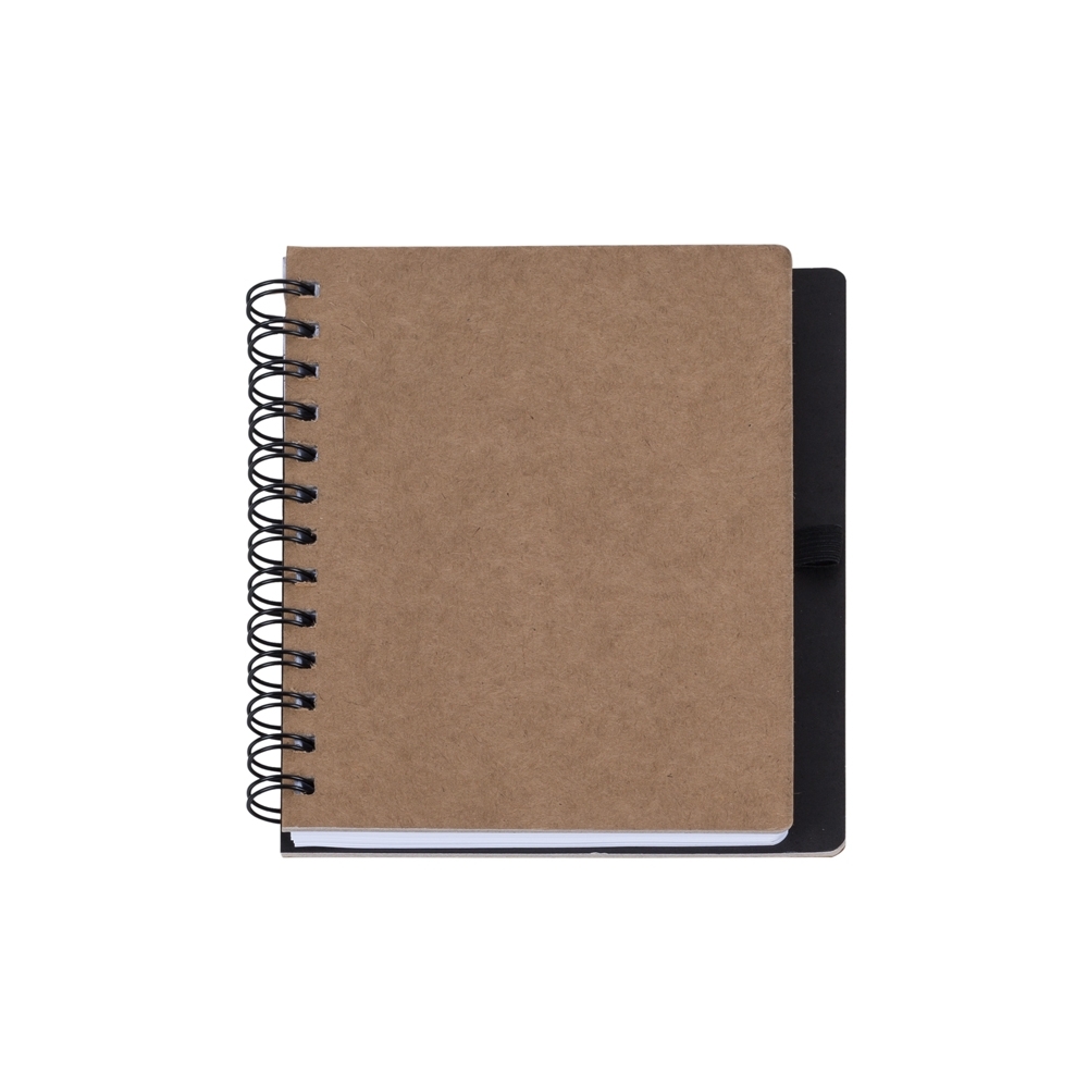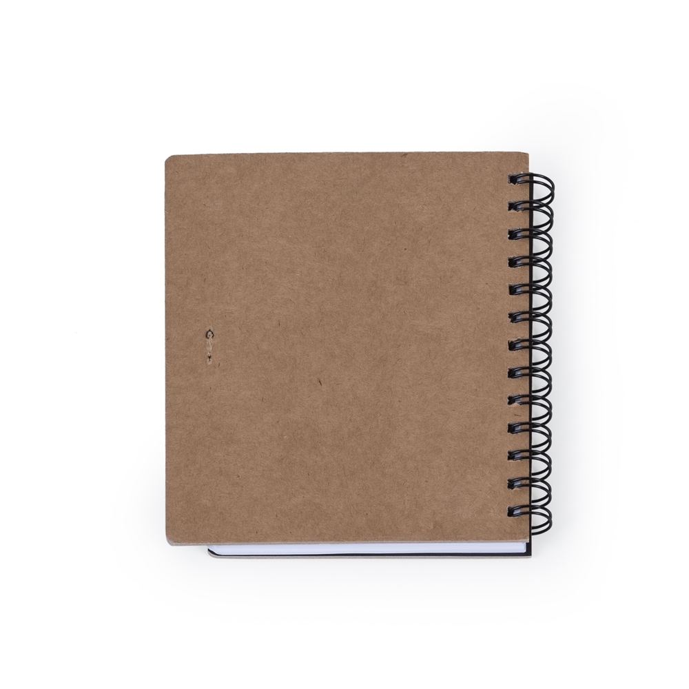 Bloco de anotações ecológico com suporte para caneta. Capa de kraft rígida de frente e verso lisa com parte interna preta, possui aproximadamente 100 folhas brancas pautadas com data no cabeçalho. Suporte elástico na parte traseira interna do bloco.