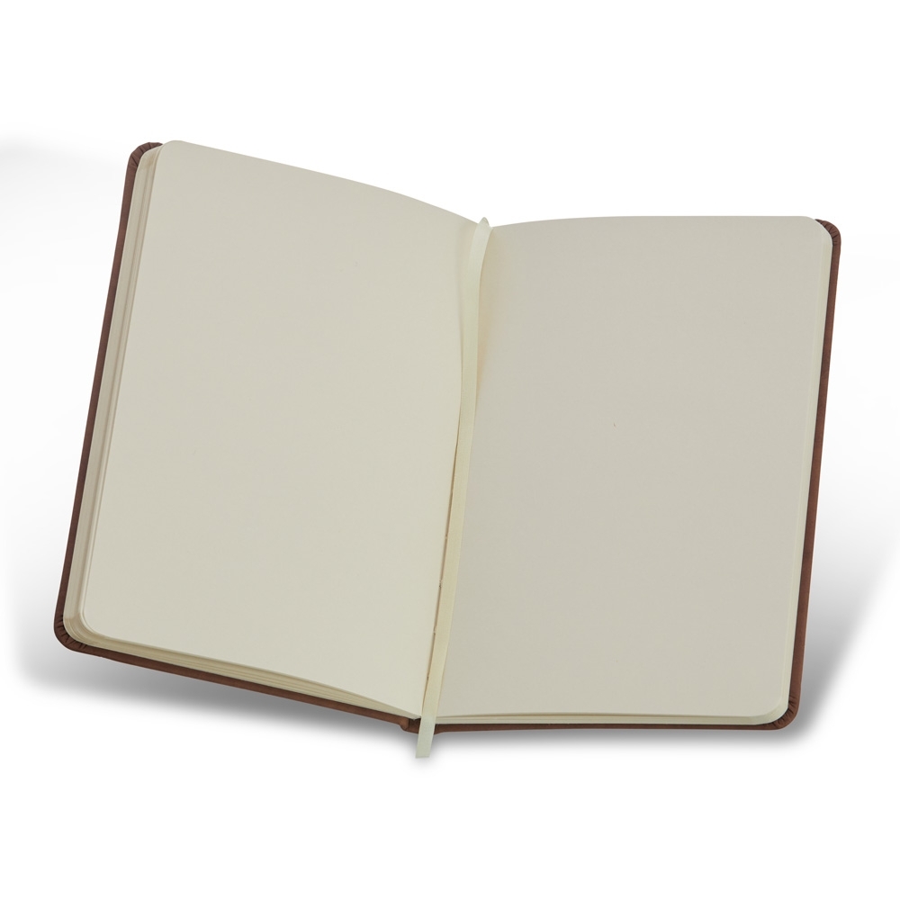 Caderneta em couro sintético, possui marca página em cetim e elástico para lacre. Contém aproximadamente 80 folhas marfim sem pauta.