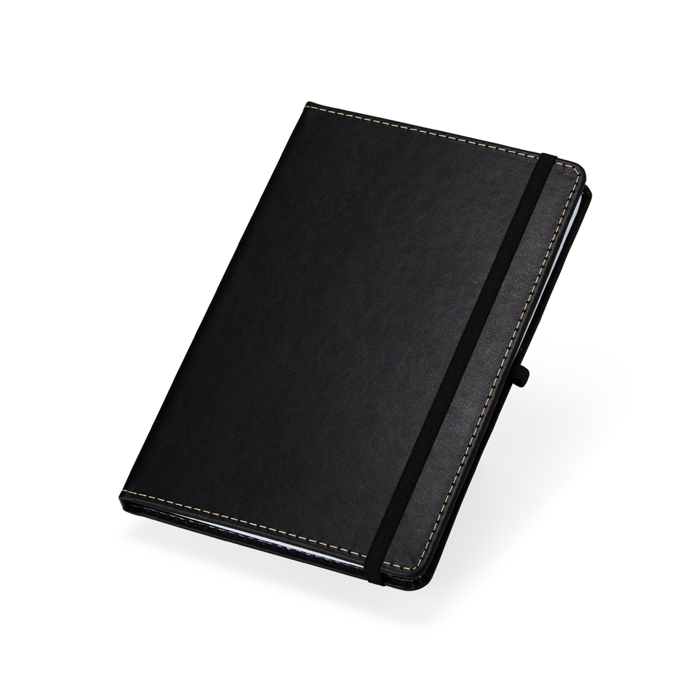 Caderneta em couro sintético com porta caneta, marca página em cetim e elástico para fecho. Contém aproximadamente 80 folhas brancas com pauta.