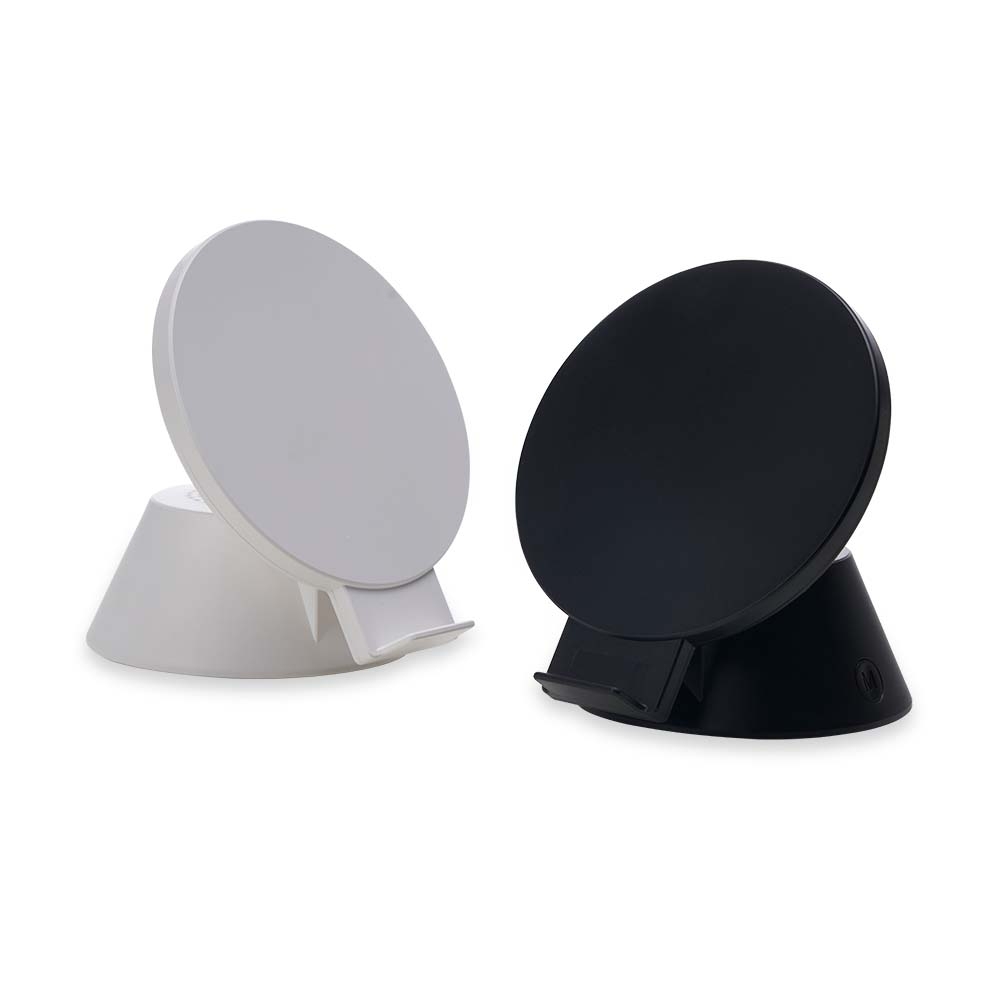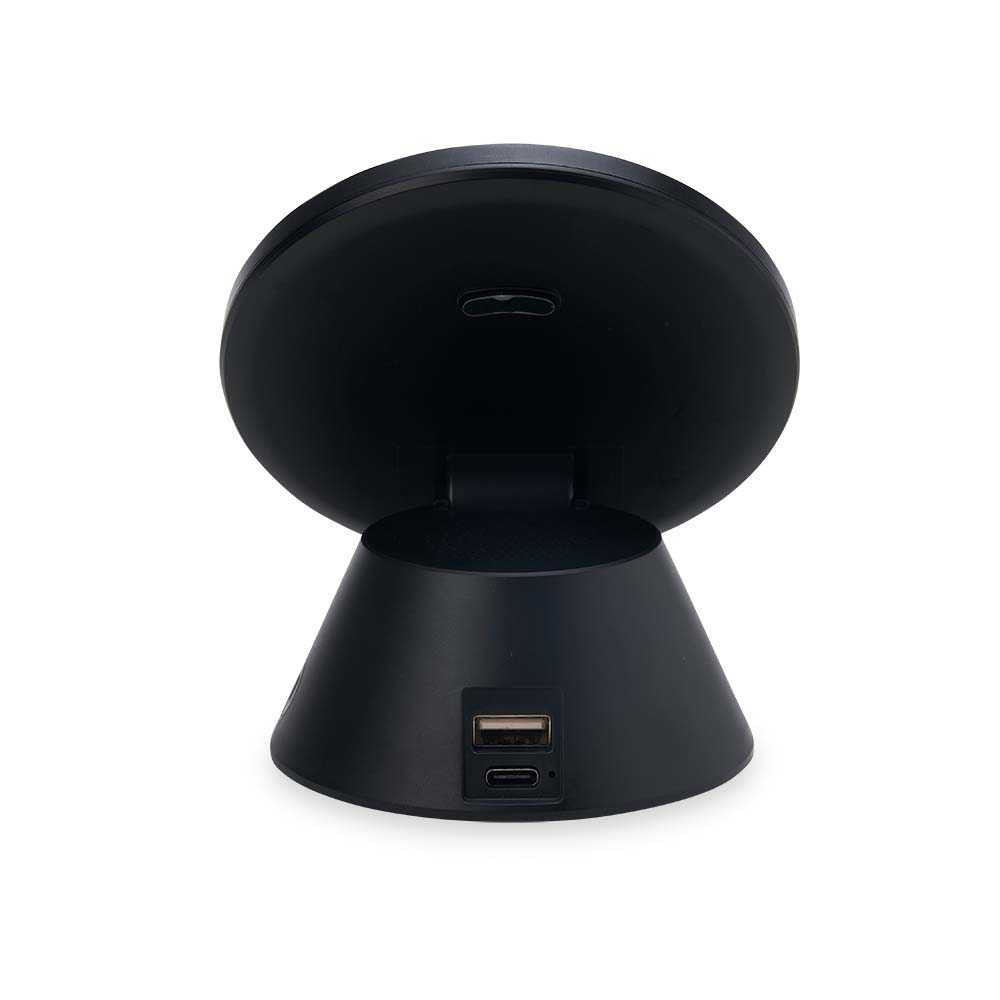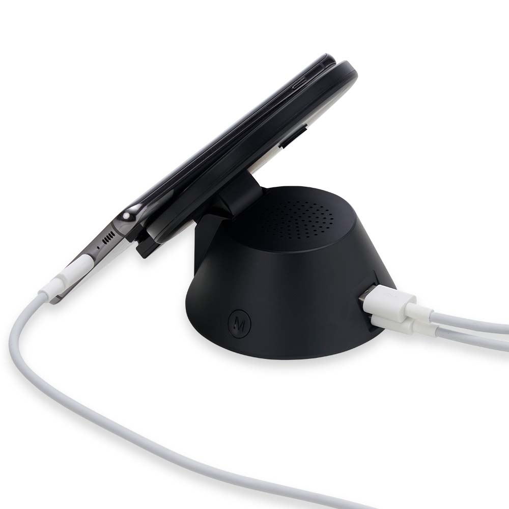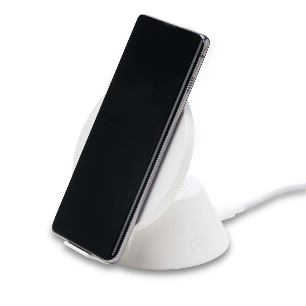Caixinha de Som bluetooth com carregador por indução. Produzido em material plástico, a caixinha possui antiderrapantes emborrachados na parte inferior, ao ser inclinado o produto também pode ser utilizado como suporte para o celular. Para desfrutar do carregamento por indução (sem fio) é fundamental que o celular possua a tecnologia QI – desta maneira é possível carregar o celular posicionando-o sob carregador, sendo necessário apenas conectar o carregador à uma fonte de energia (USB ou diretamente na tomada). Acompanha cabo USB Tipo-C.
