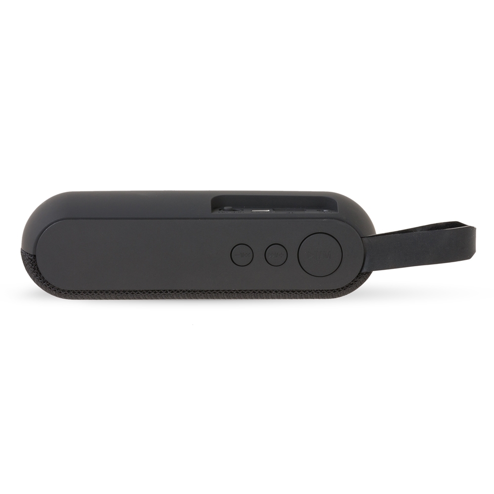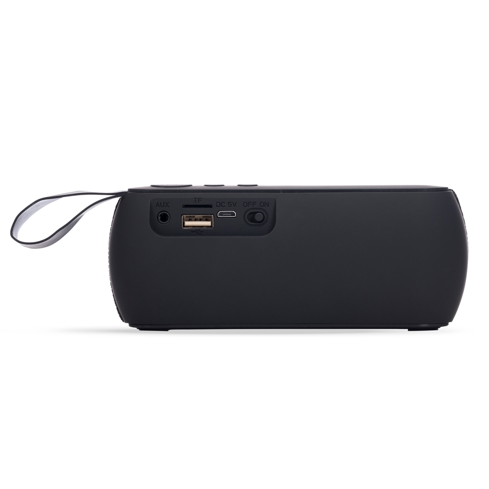 Caixa de Som Multimídia. Produzida em material emborrachado com alça lateral, tela de proteção dos falantes em tecido, parte inferior com borrachas anti-deslizantes. Possui os botões de Play/Pause e Modo; Aumentar e diminuir volume/avançar e retroceder faixas; Entrada auxiliar P2; Entrada TF (cartão MicroSD); Entrada USB; Microfone; Entrada DC 5V e botão para ligar e desligar. Acompanha cabo USB e cabo Auxiliar P2.