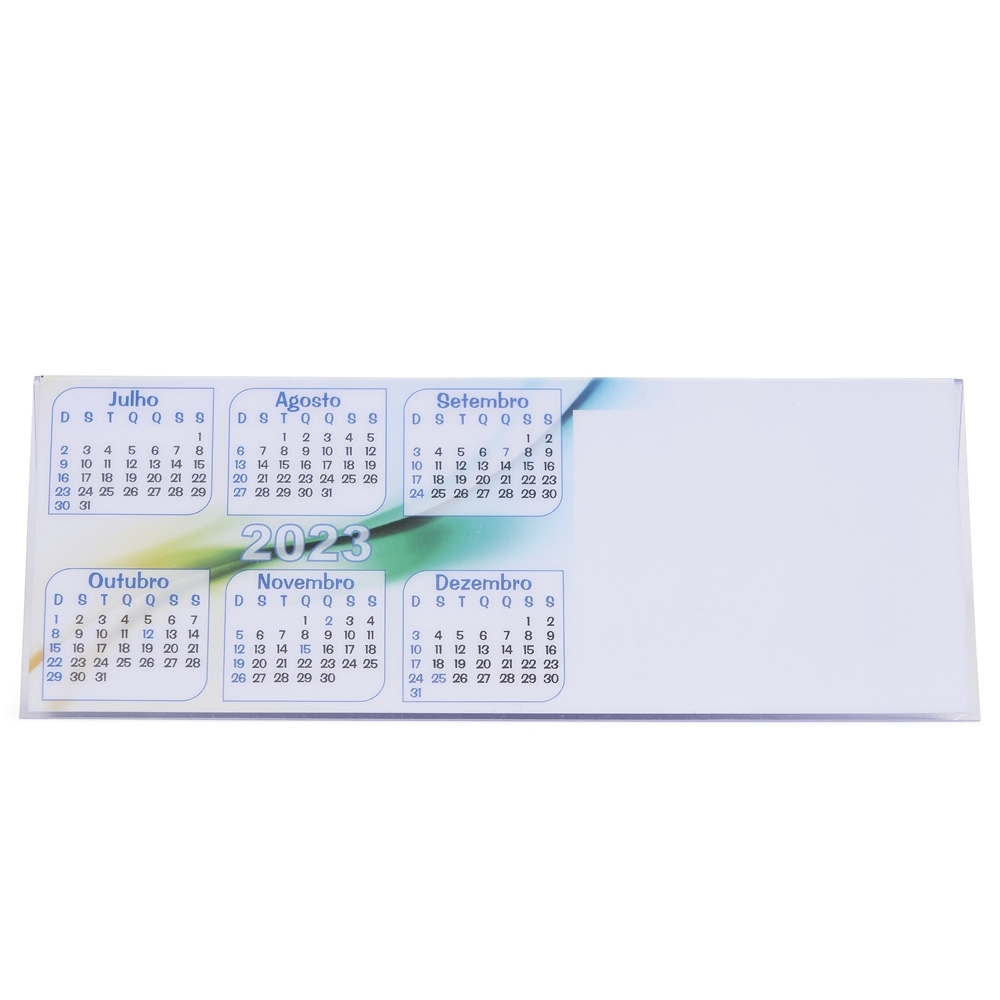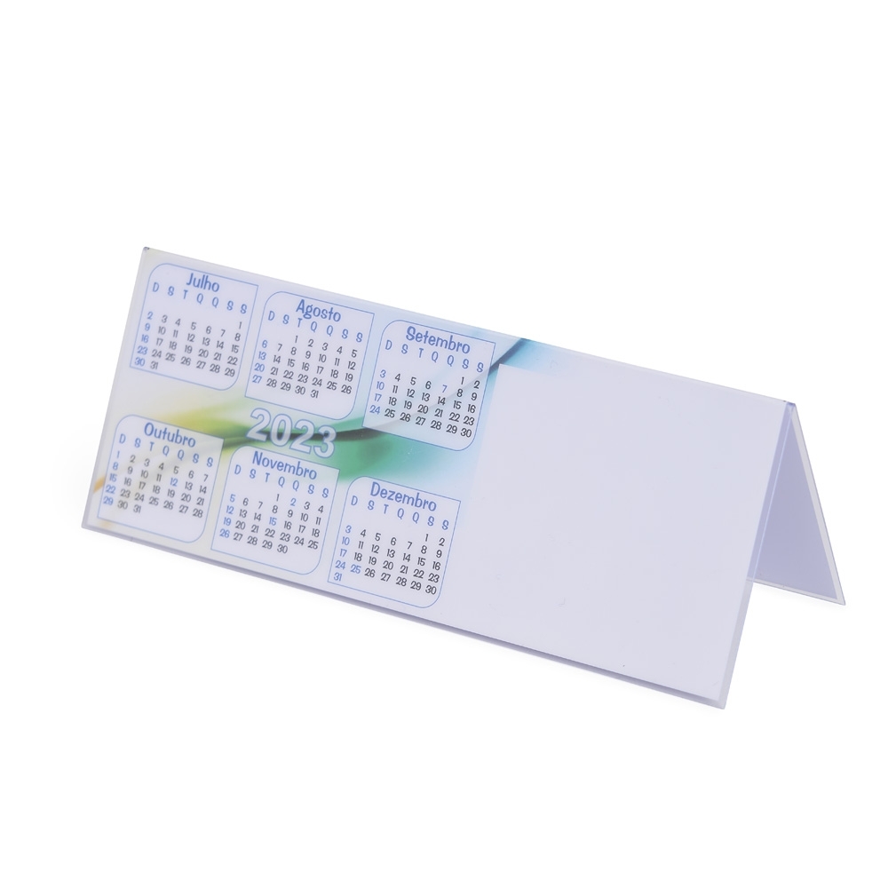 Calendário plástico 2023, impresso em papel offset e encapsulado em plástico rígido.