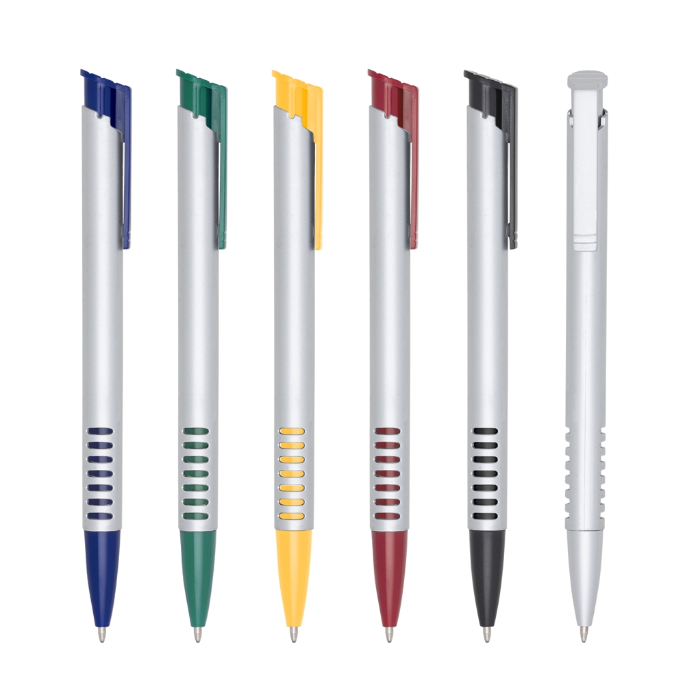 Caneta plástica com carga esferográfica azul e acionamento por clique.
