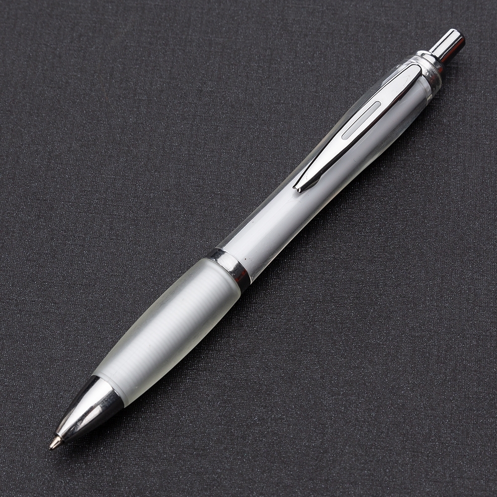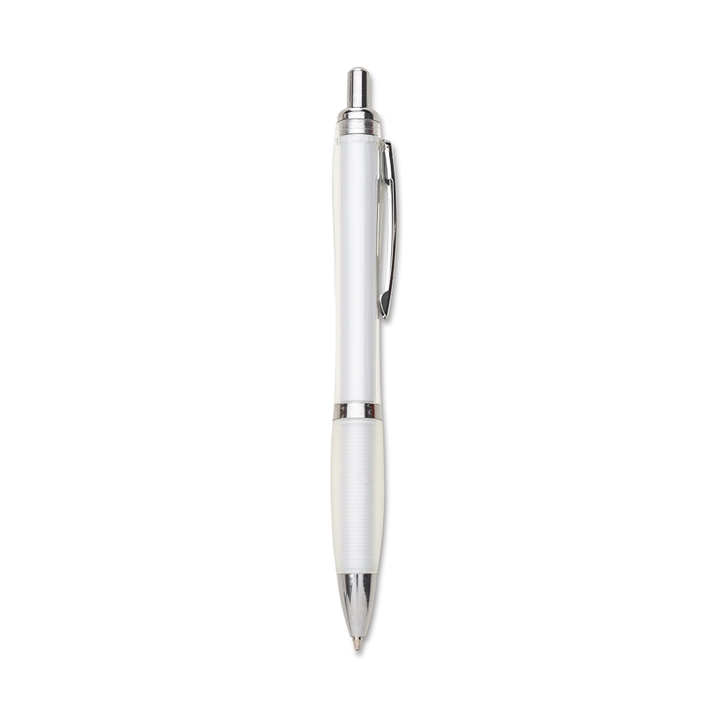 Caneta plástica com detalhe emborrachado, carga esferográfica azul e acionamento por clique.