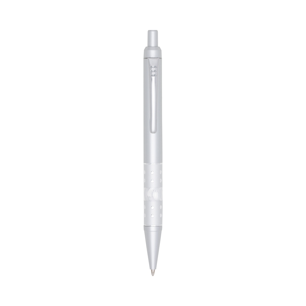 Caneta plástica com detalhe strass, carga esferográfica azul e acionamento por clique.