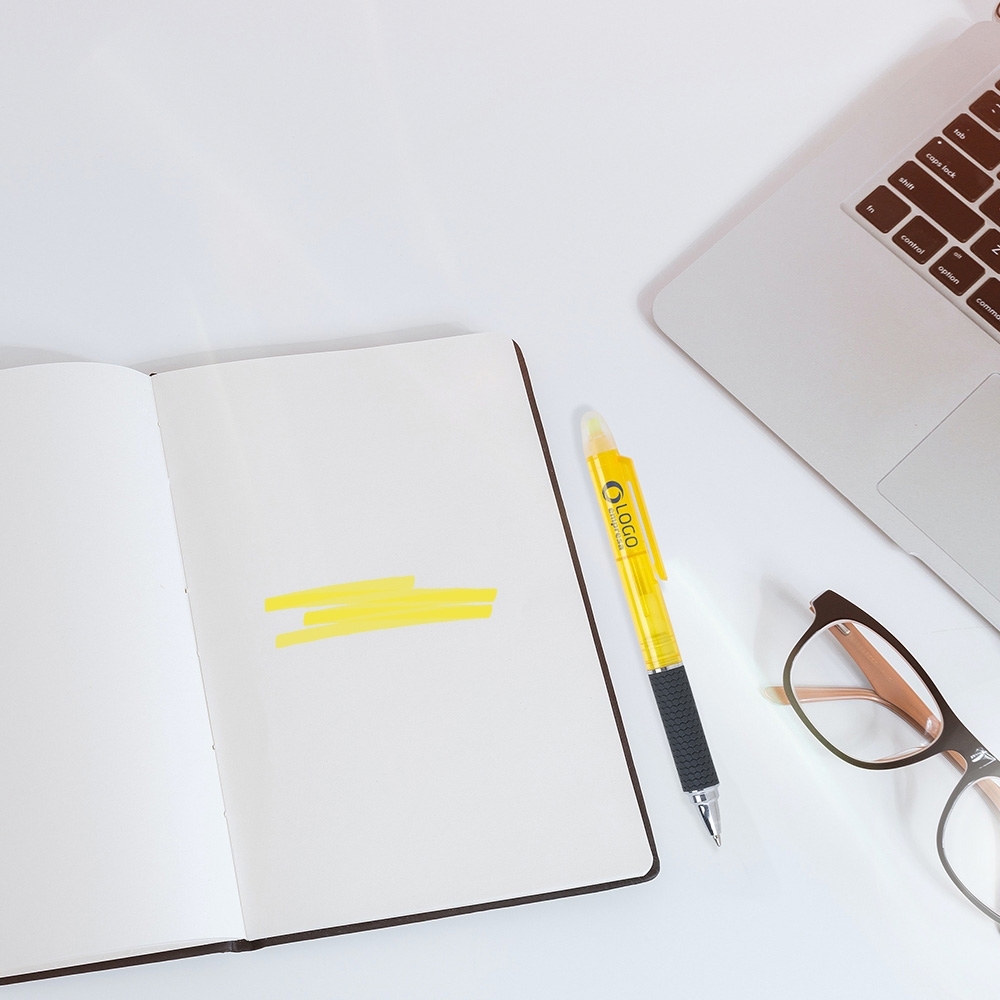 Caneta plástica com marca texto, contém detalhe emborrachado e tampa protetora para o marca texto. Carga esferográfica azul e acionamento por rotação.