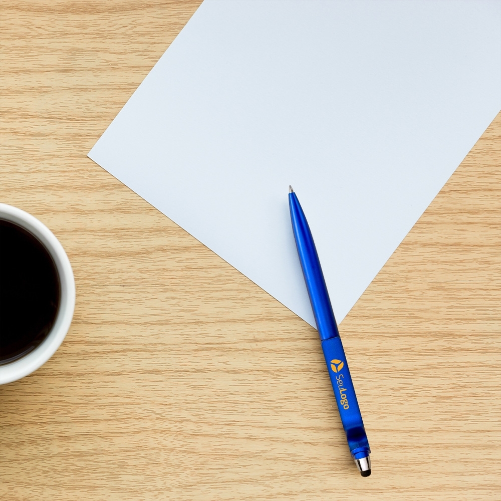 Caneta plástica com suporte para celular e touch screen. Carga esferográfica azul e acionamento por rotação.