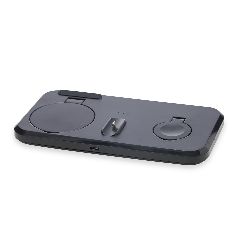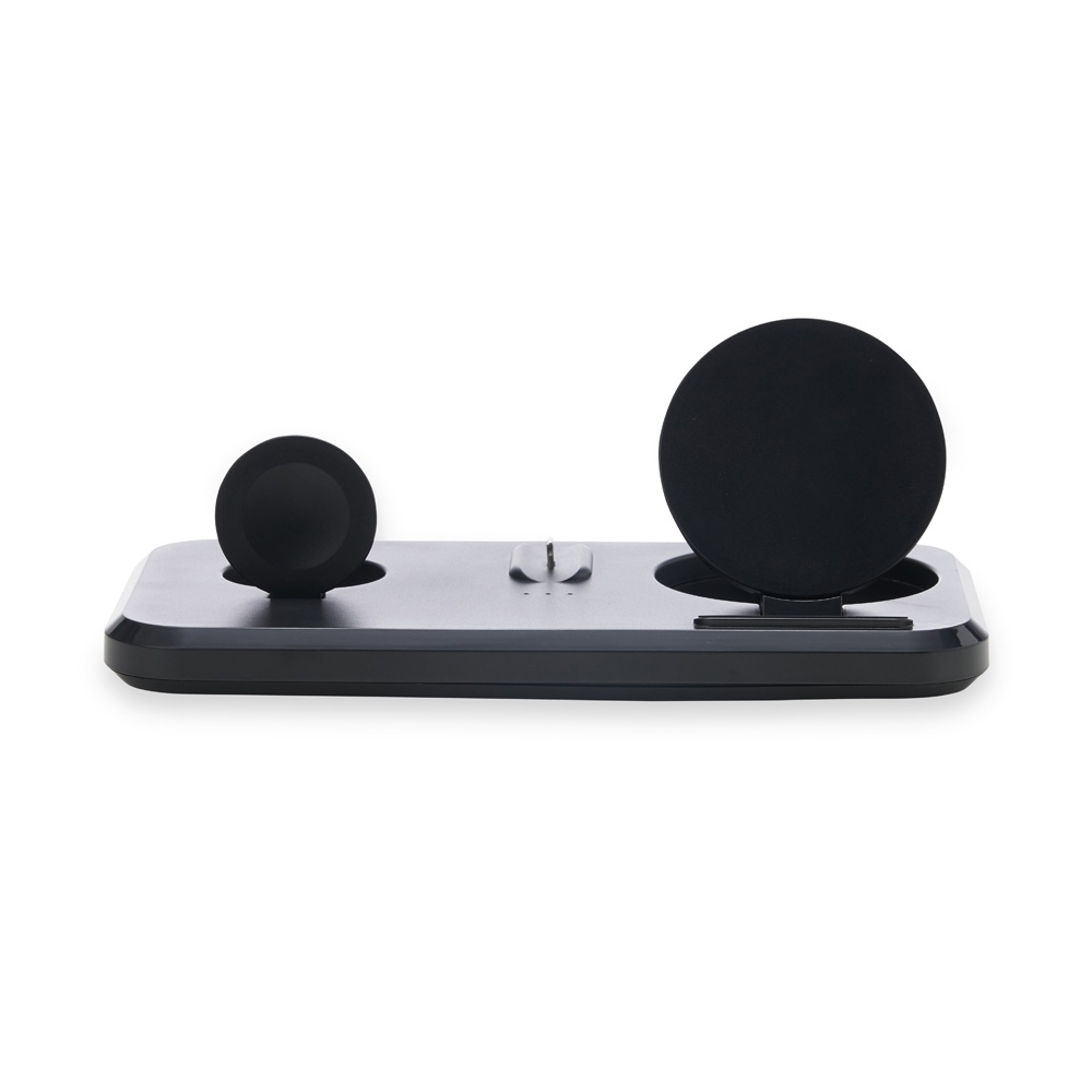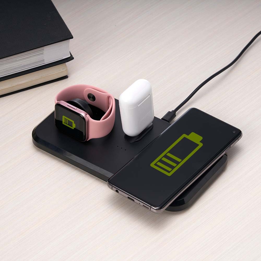 Estação de carregamento 3 em 1 para celular, iwatch e fones com entrada Lightning. Com sistema de carga por indução rápida, a estação permite o carregamento sem fio de celulares e iwatchs habilitados com estas tecnologias, além destes suportes, a estação conta ainda com um carregador para fones através do conector Lightning. Sua base contém tapetes de silicone antiderrapantes. Acompanha cabo USB tipo-C.