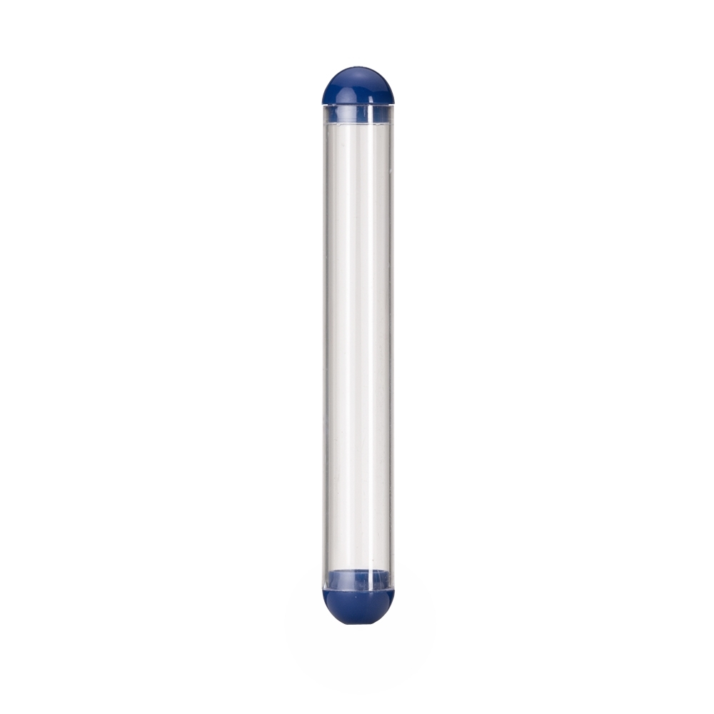 Estojo plástico formato tubo compatível para uma caneta, possui tampas coloridas nas extremidades.