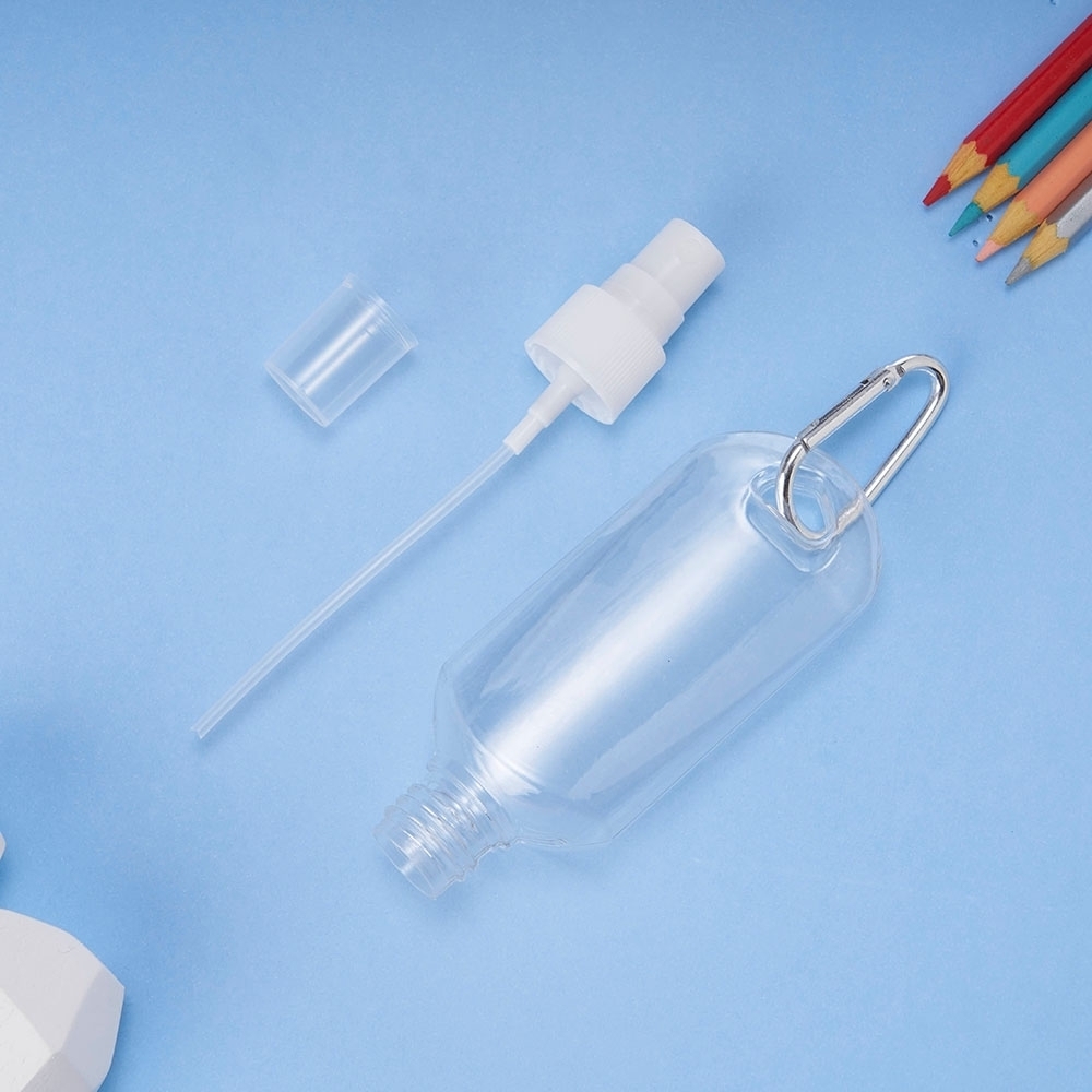 Frasco plástico spray com capacidade de 100ml, contém tampa branca com encaixe rosqueável e acompanha chaveiro mosquetão para transporte.