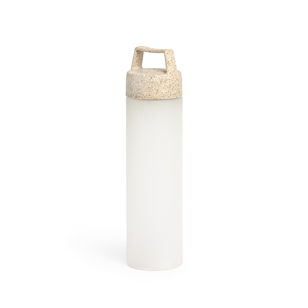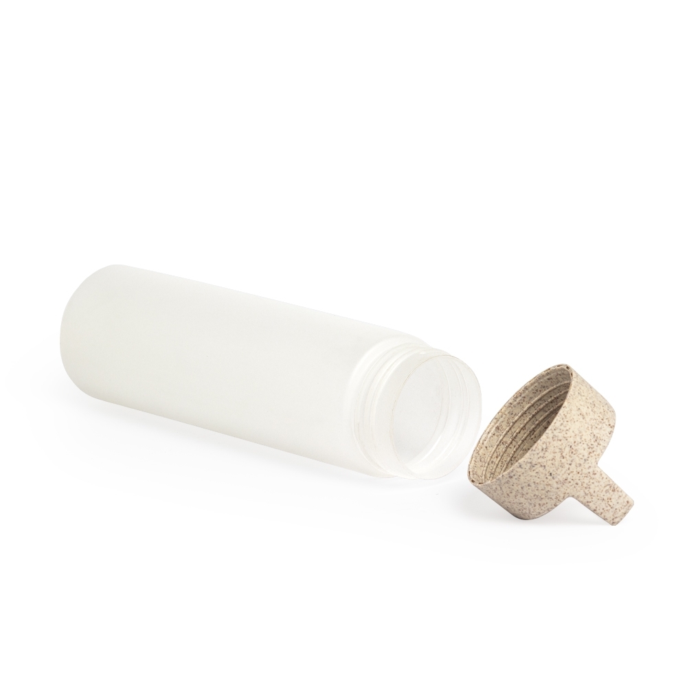 DescriçãoGarrafa plastica com capacidade de 650 ml, com tampa de fibra de arroz rosqueável e alça.