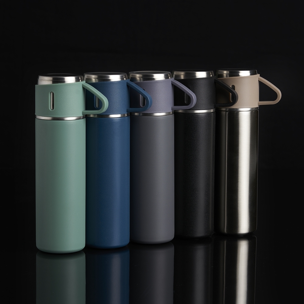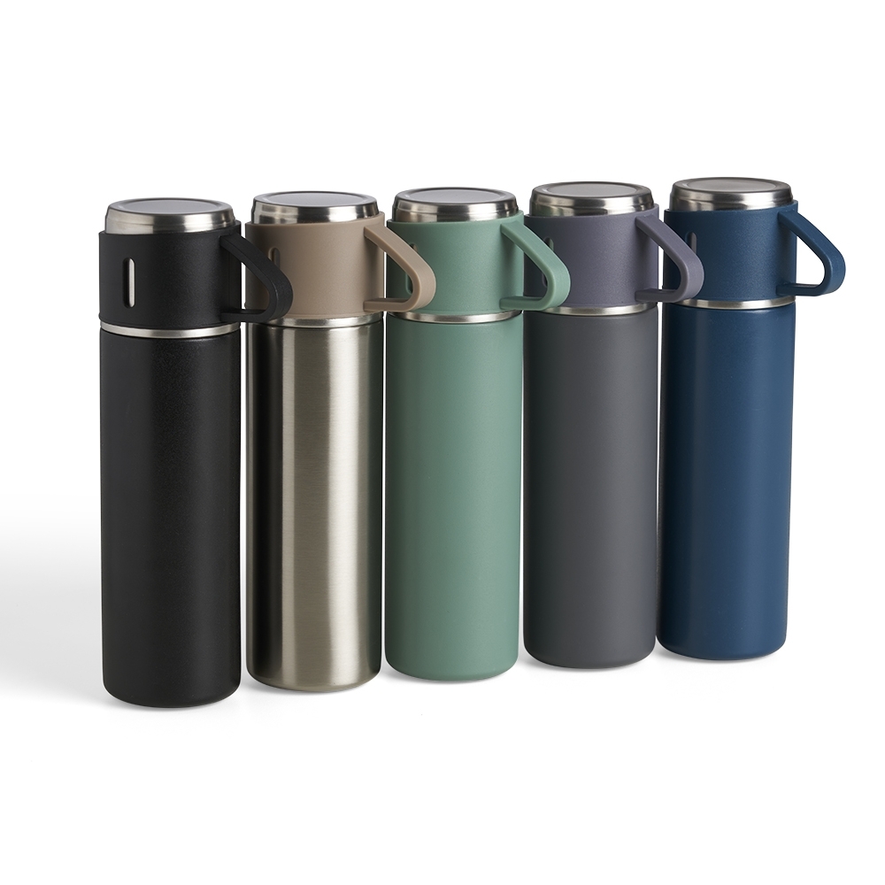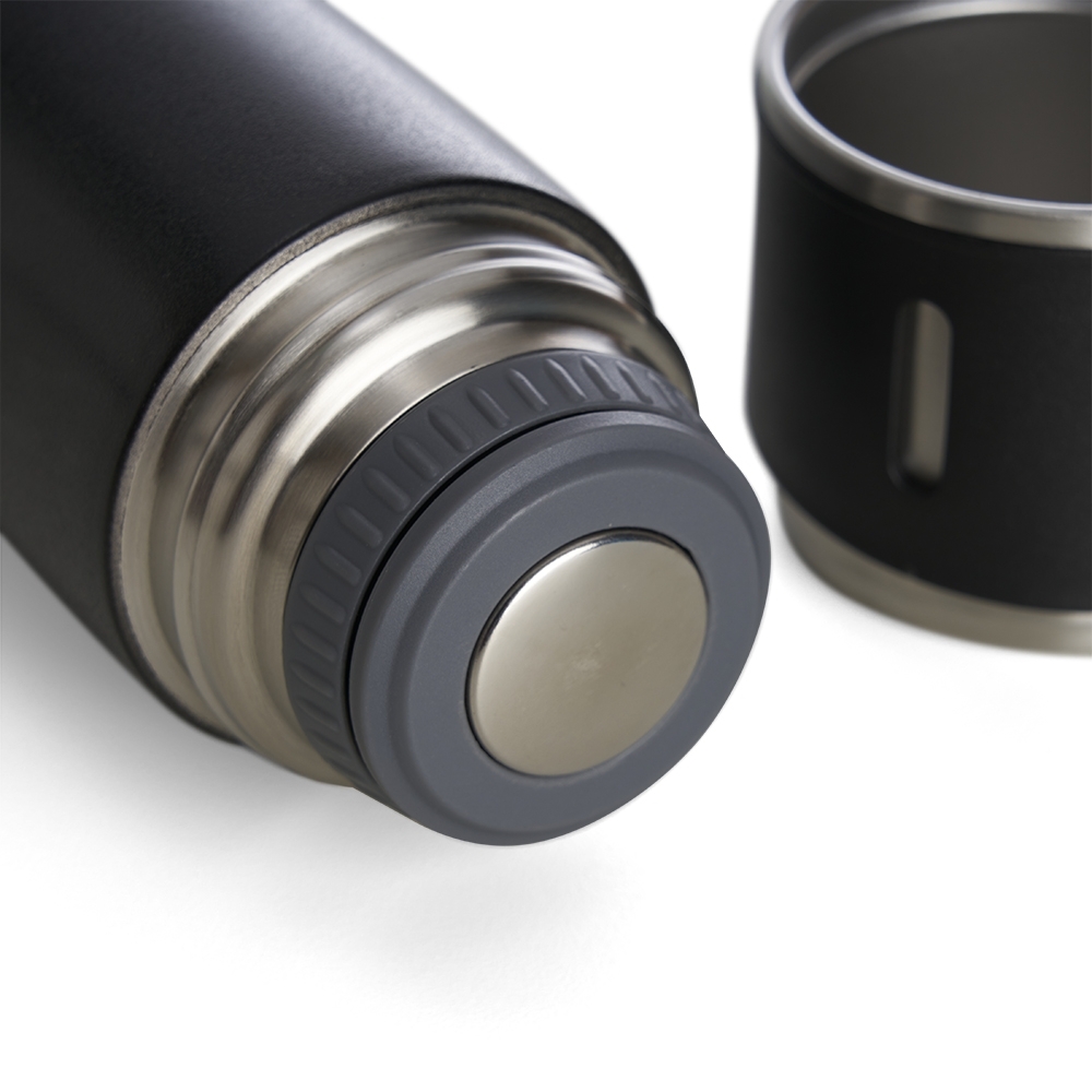 Garrafa térmica 450ml em inox com tampa que pode ser utilizada como caneca, tampa interna em plástico resistente (basta um clique para abrir ou fechar), base com borracha antiderrapante.
