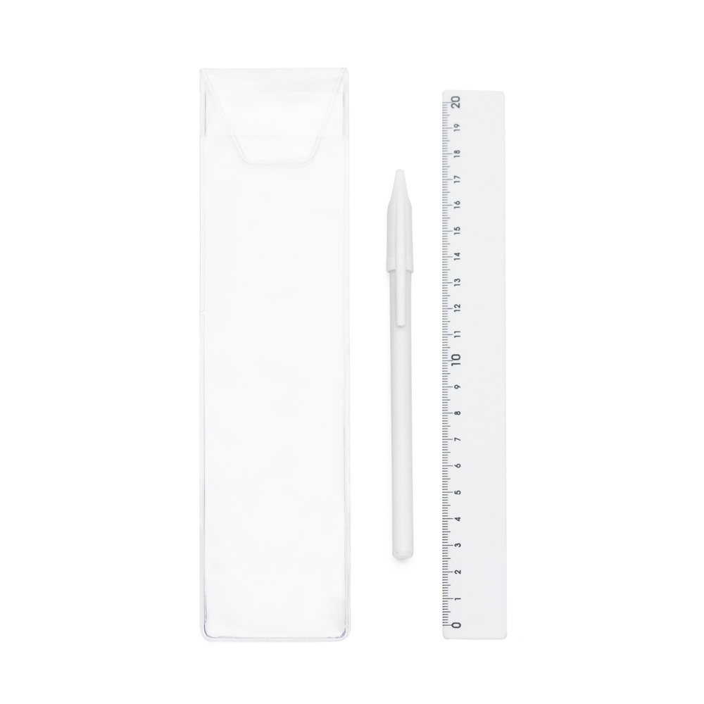 Kit régua e caneta plástica em estojo plástico transparente. Caneta simples com tampa e régua de 20cm.