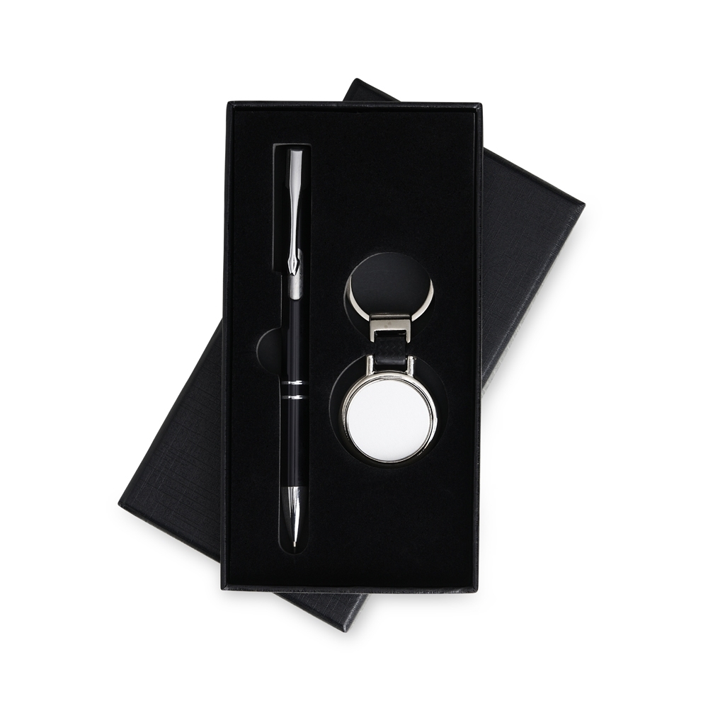 Kit executivo com 2 peças em estojo preto de papelão revestido com espuma interna. Possui: Caneta metálica com carga esferográfica azul e acionamento por clique; chaveiro metal redondo com duas argolas.