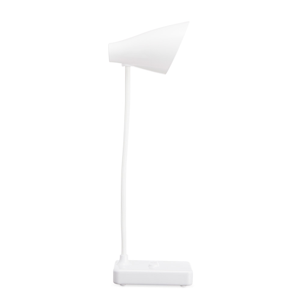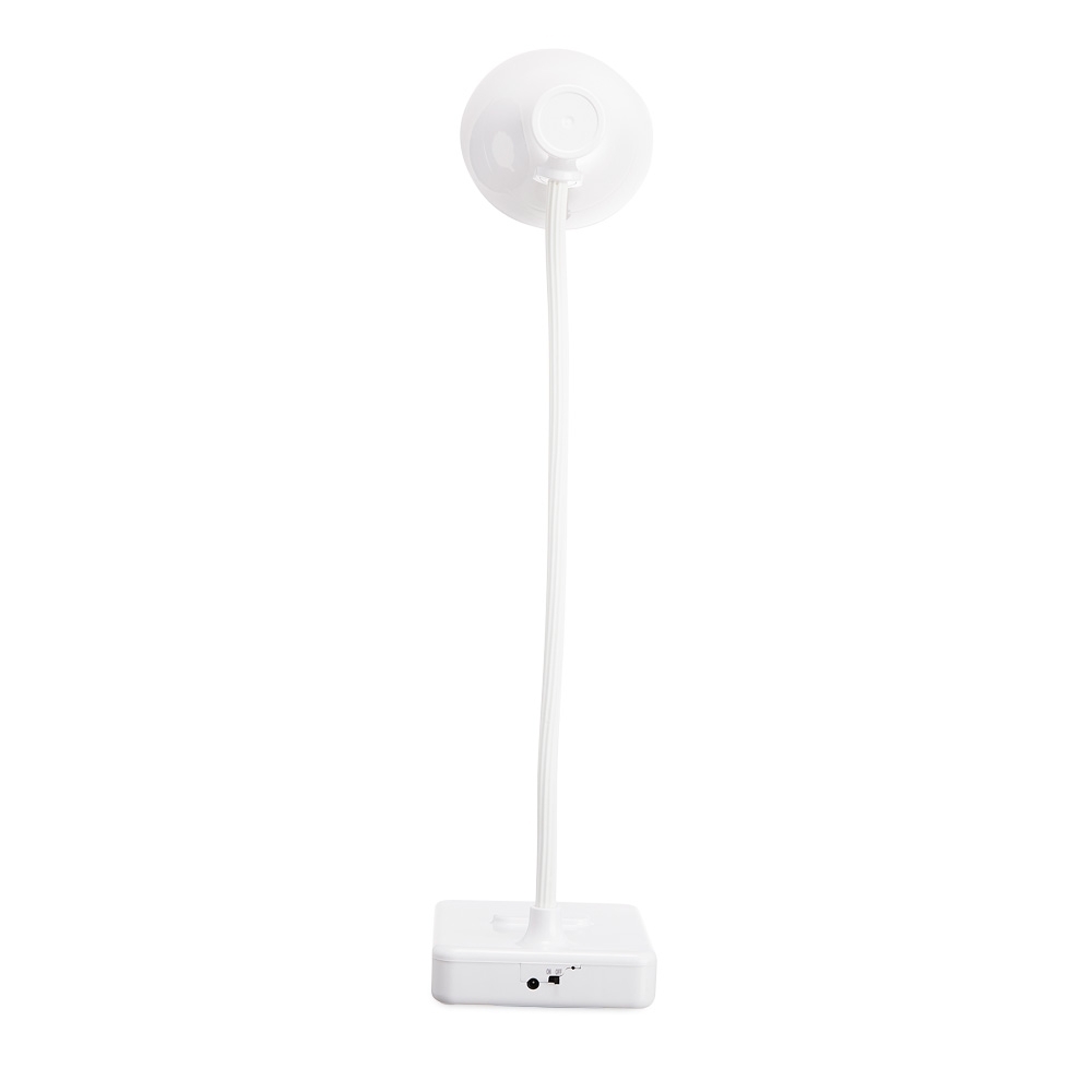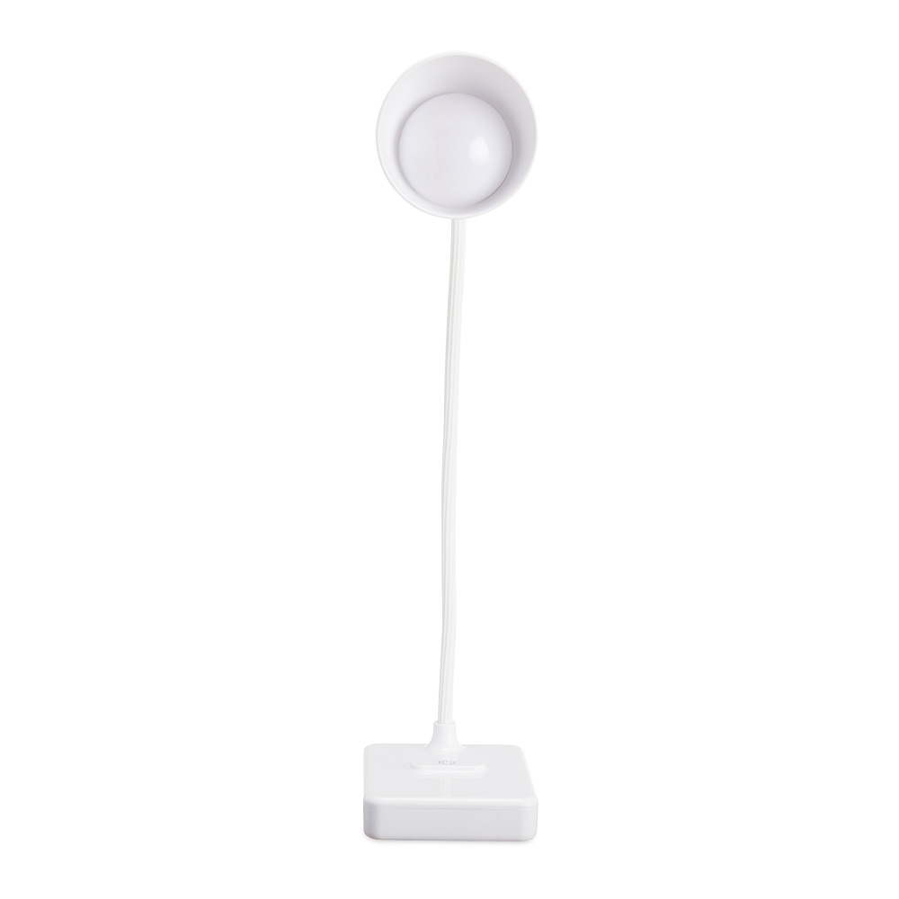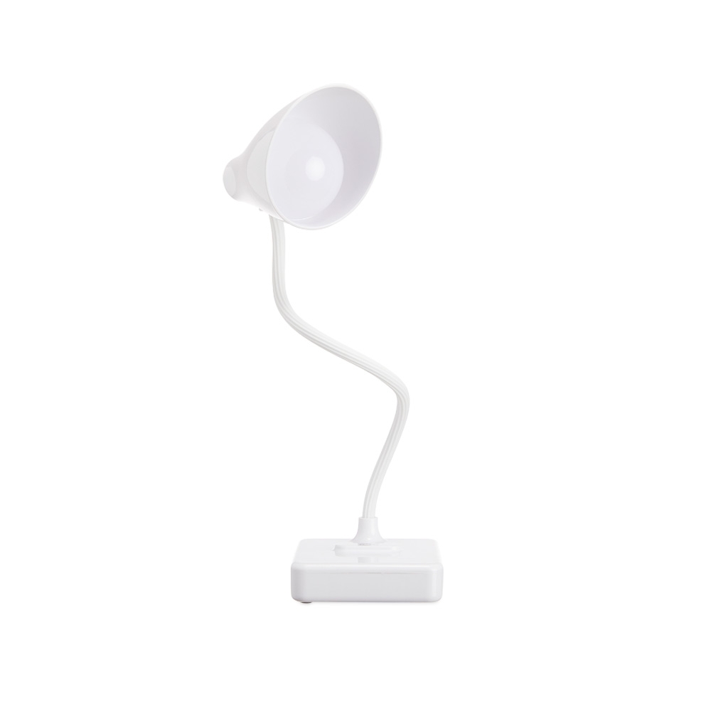 Luminária plástica touch articulável e suporte para celular. Contém três tipos de iluminação: luz branca (fria), luz de descanso (amarela), e luz forte (junção da luz branca com a amarela). Obs: o produto possui bateria interna e acompanha cabo USB.