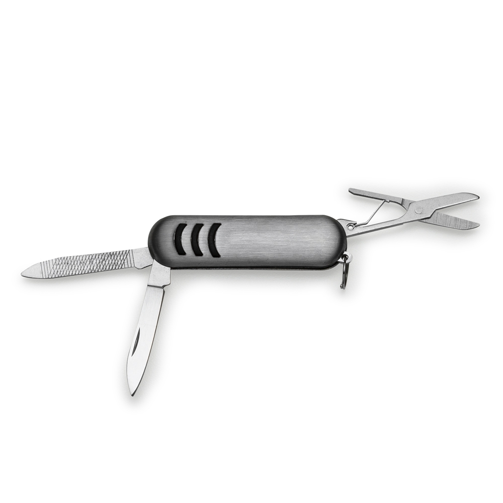 Mini canivete metal 3 funções com detalhes emborrachados preto(três linhas frente e verso). Possui: lixa, lâmina de corte e mini tesoura e acompanha pequena argola para utilizar como chaveiro.