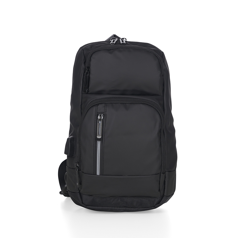 Mochila de ombro com entrada USB lateral. A mochila possui 3 bolsos frontais 1 compartimento principal e 1 bolso traseiro, sendo 1 bolso frontal com detalhe refletivo no zíper, além de 3 compartimentos internos, sendo 1 para armazenar tablet, netbook ou Ipad de até 9 polegadas. Alça com tira de nylon, 2 fivelas para opção de encaixe, parte traseira com revestimento espumado antitranspirante, e alça de mão em nylon.