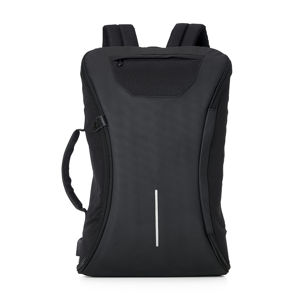 Mochila confeccionada em poliéster. Possui dois compartimento principal com divisórias para documentos, eletrônicos e caneta, bolso acolchoado para Notebook até 17 polegadas. compartimento frontal com zíper, compartimento lateral com zíper bolso oculto na parte traseira com zíper. Tecido Impermeável. Compartimento traseiro para ocultação das alças de ombro. Adaptador USB externo com cabo acoplado, permitindo a conexão de um carregador portátil de dentro da mochila e transferência da carga para o lado externo, ocultando o carregador e viabilizando a utilização do celular durante o processo. Contém zíperes com pegadores metálicos, alça de mão em nylon, alças para as costas ajustáveis com revestimento espumado antitranspirante e alça lateral que possibilita que a mochila seja carregada como uma pasta.