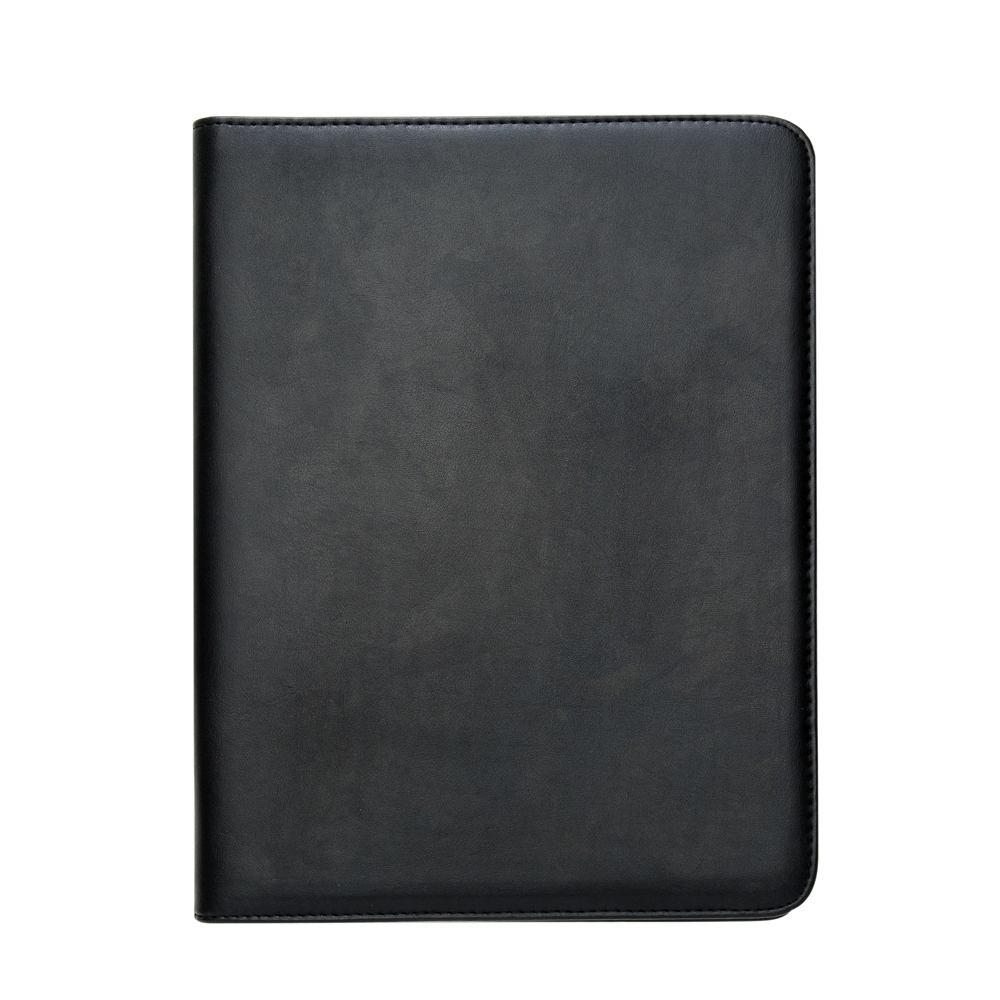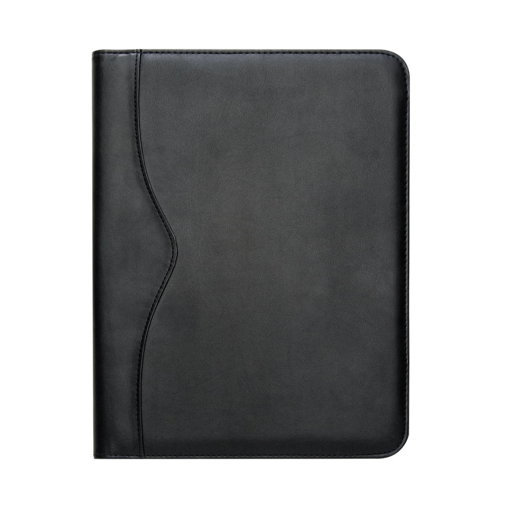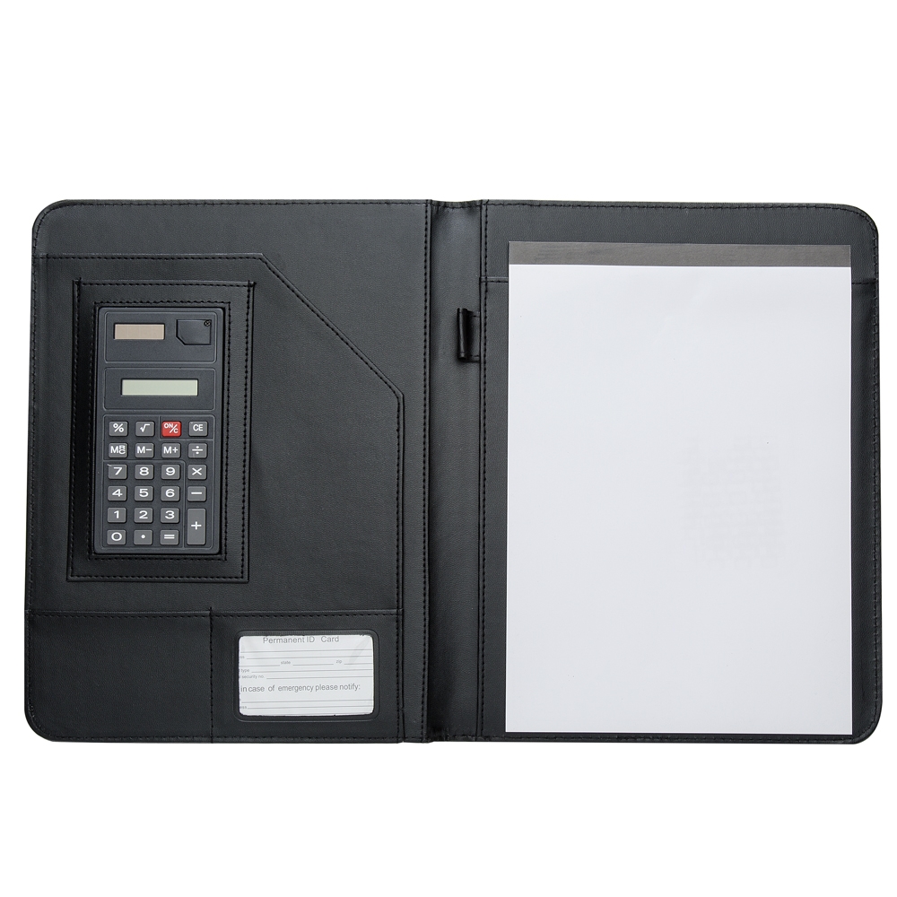 Pasta convenção de couro sintético, possui calculadora solar plástica de 8 dígitos, suporte para cartão, suporte com visor para cartão de identificação, suporte para arquivar documentos, suporte para caneta(não acompanha caneta) e bloco com 20 folhas pautadas.