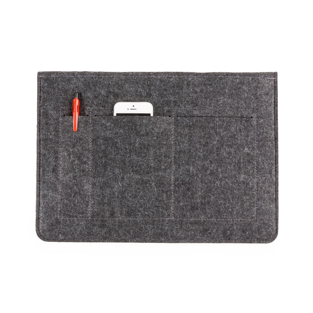 Pasta envelope com forro e dois bolsos internos. Tecido de feltro com tonalidade mais clara na parte interna e dois botões prata que podem ser encaixados em dois tamanhos. Possui também no verso outros bolsos: dois para documentos e um para canetas. Acompanha placa metálica para personalização.