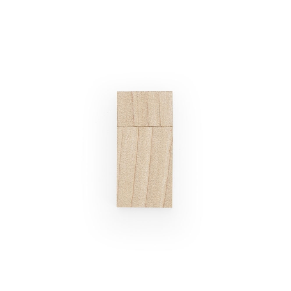 Pen drive de 4GB em madeira de formato retangular. Contém imãs na tampa e no corpo para que fiquem presa uma a outra.