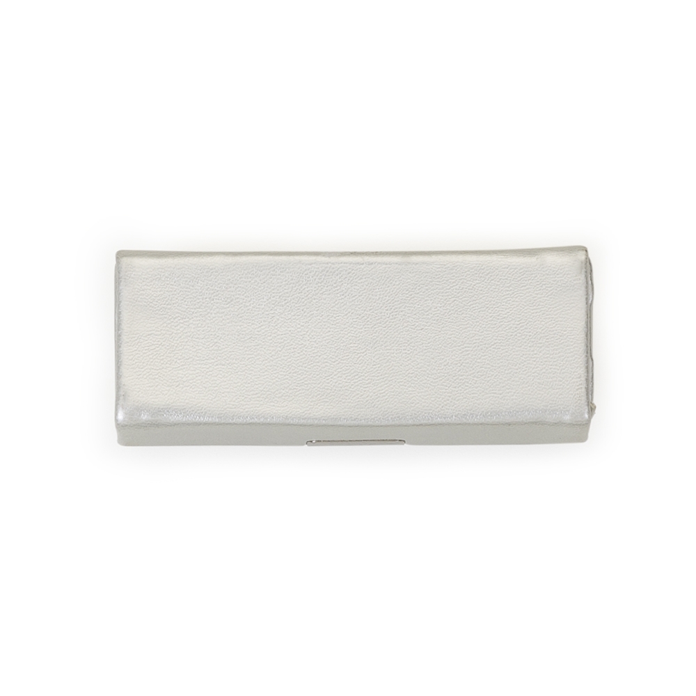 Porta batom em couro sintético prata com plaquinha de metal frontal com botão para abrir/fechar, possui um espelho interno.