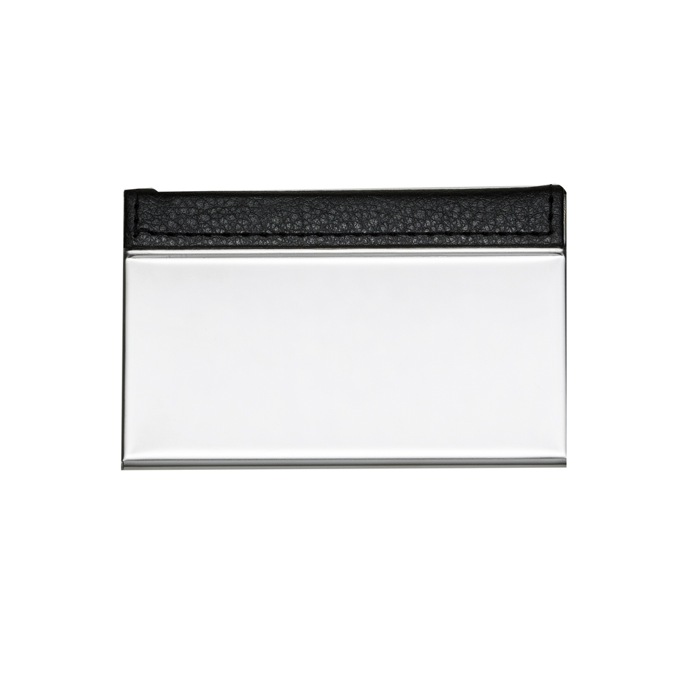 Porta cartão de metal com couro sintético. Couro com textura e costura preta, parte interna revestida com veludo.