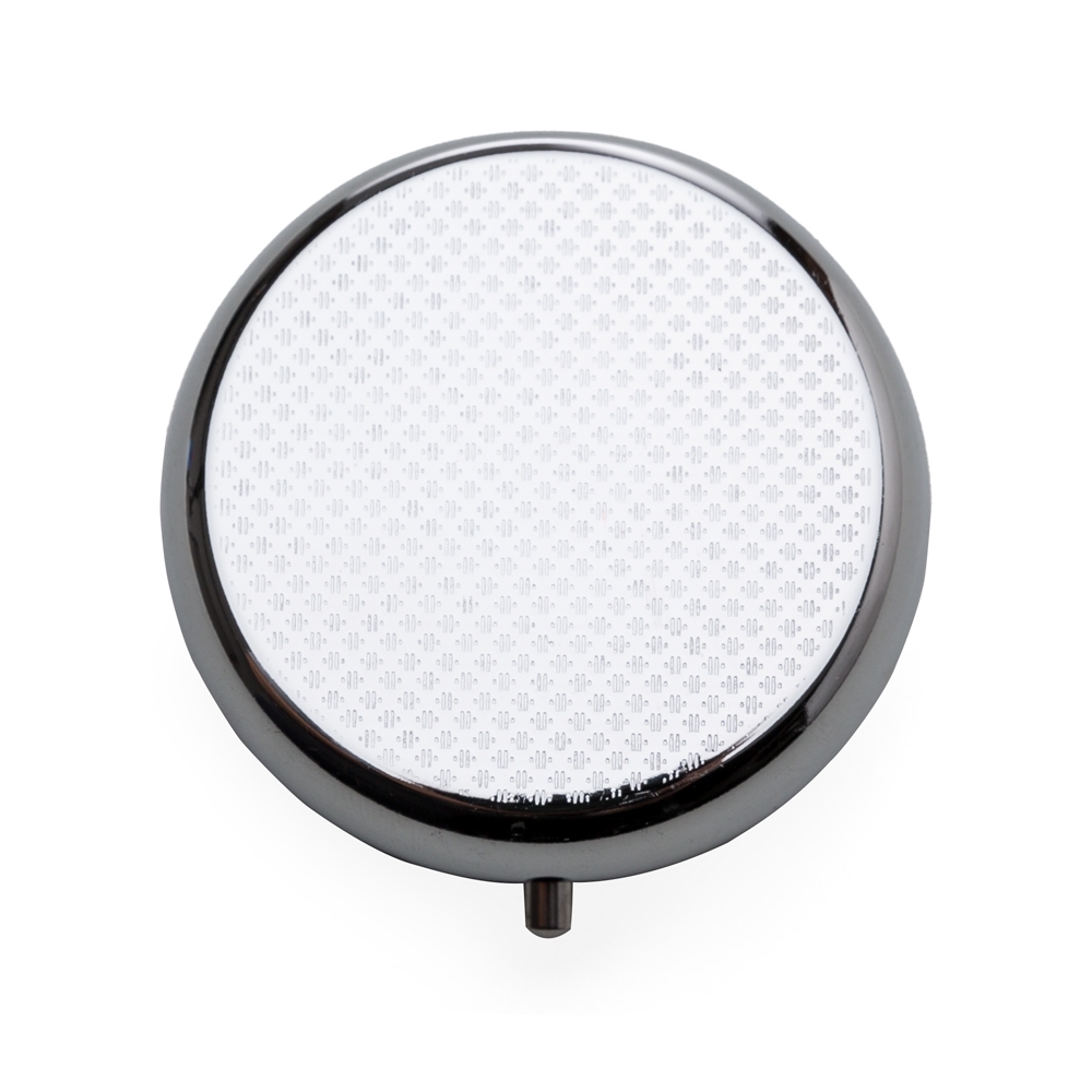 Porta comprimido redondo de metal, parte superior externa(tampa) espelhada e lado interno fosco. Parte inferior externa com detalhes em relevo, área interna com três divisórias plásticas, possui um botão para abrir.