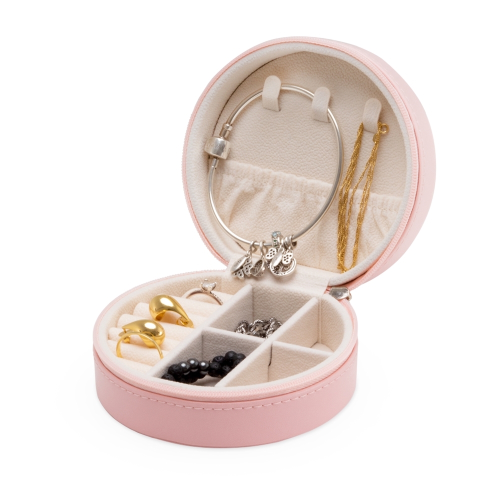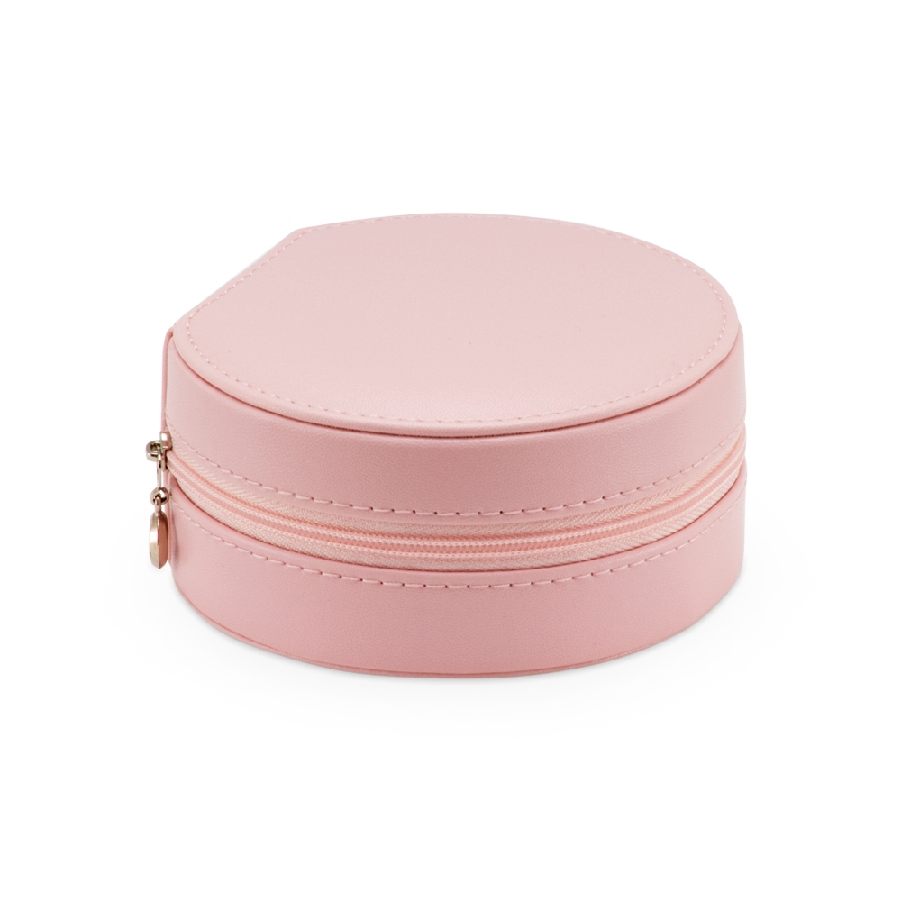 Porta joias de couro sintético com revestimento aveludado. Possui compartimentos internos para anéis, brincos, pulseiras e colares.