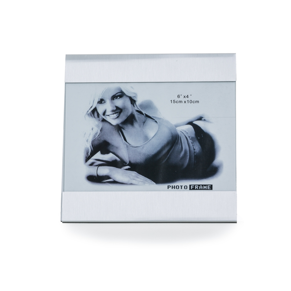 Porta retrato 15 x 10 com duas chapas metálicas(superior e inferior) que podem ser removidas. Possui uma tela de vidro e parte traseira(apoio) revestido de veludo, acompanha película protetora.