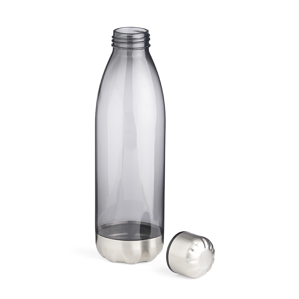 Squeeze plástico 700ml formato garrafa. Corpo transparente colorido, possui tampa e base em alumínio.