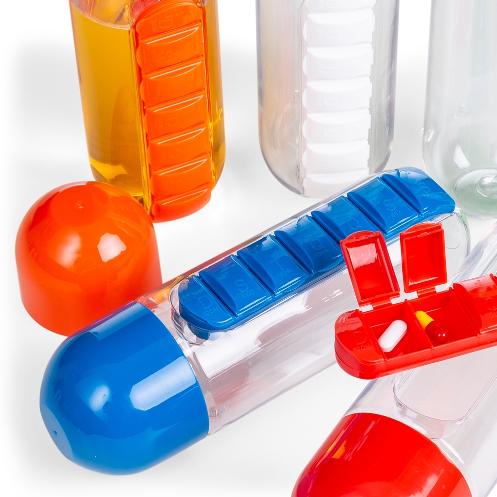 Squeeze 700ml plástico com porta comprimido. Garrafa transparente com encaixe para bandeja de comprimidos colorida, especificado por siglas referente os dias da semana, possui quatro “pézinhos” no qual auxiliam o squeeze a fica na posição horizontal. Tampa rosqueável colorida.